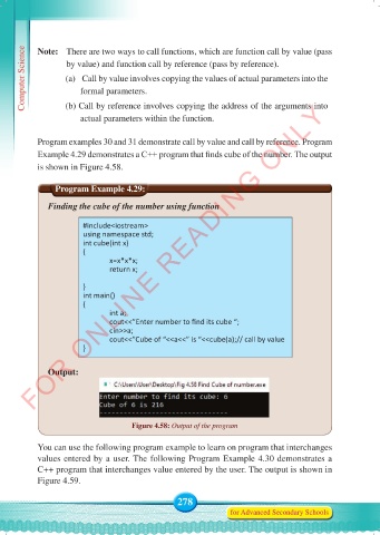 Example 4.29 demonstrates a C++ program that finds cube of the number. The output