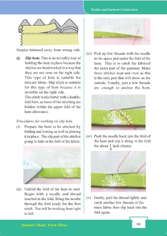 it in place. The slip part of the stitch is (iv) Push the needle back into the fold of