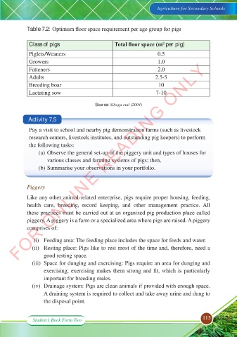 Table 7.2: Optimum floor space requirement per age group for pigs