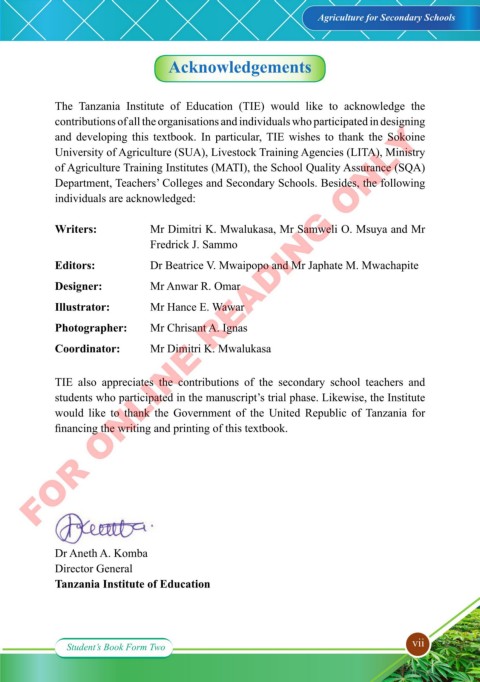 The Tanzania Institute of Education (TIE) would like to acknowledge the