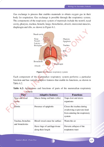 Table 6.2: Adaptations and functions of parts of the mammalian respiratory
