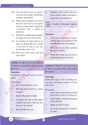 (iii) Fats and oils dissolve in organic 6. Tabulate your results showing