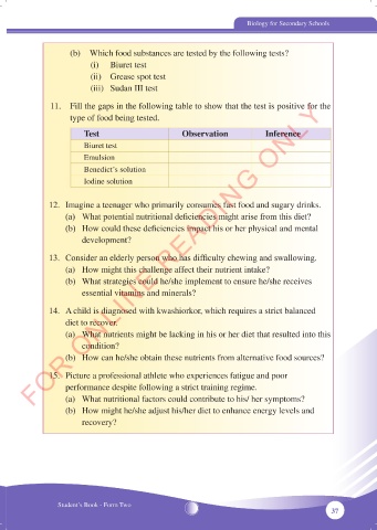 (b) Which food substances are tested by the following tests?