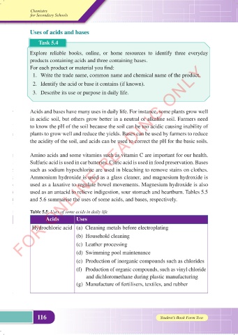 and 5.6 summarise the uses of some acids, and bases, respectively.