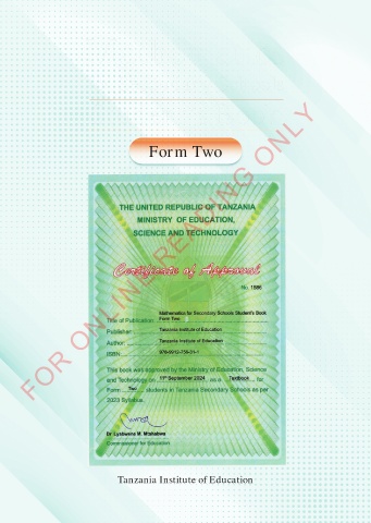 Mathematics for Secondary Schools Student’s Book FOR ONLINE READING ONLY Form Two Tanzania Institute of Education 11/10/2024 20:11:02 MATHEMATIC F2 v5.indd 1 11/10/2024 20:11:02 MATHEMATIC F2 v5.indd 1