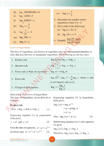 (n) log 1 = x 6. Simplify log 25 log5+ . Mathematics for Secondary Schools