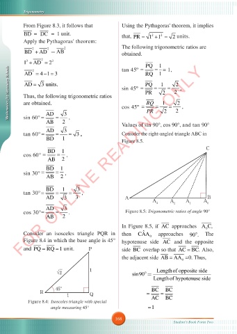 Mathematics for Secondary Schools Thus, the following trigonometric ratios sin 45º = PQ = = 1 1 = = 2 2 2 , .