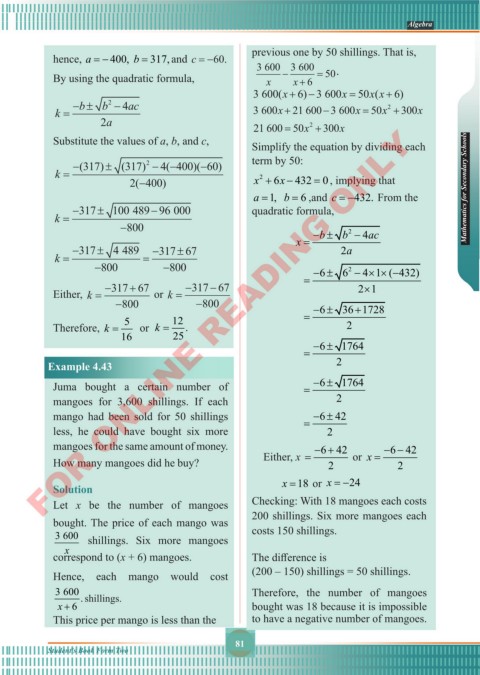 2( 400) x + 6x − 432 0= , implying that Mathematics for Secondary Schools