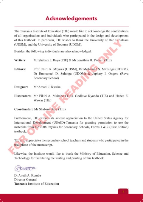 The Tanzania Institute of Education (TIE) would like to acknowledge the contributions